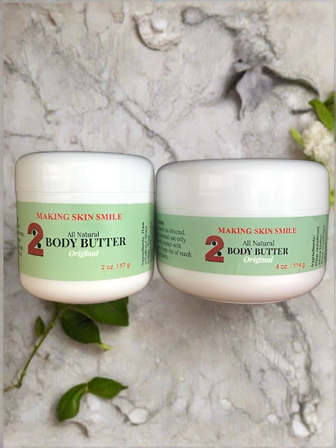 2 Percent All Natural Body Butter is handmade with natural, unrefined and organic ingredients. It's crafted with care for everyday use to revitalize, replenish, moisturize and nurture healthy, glowing skin. It's rich texture melts into your skin. Made for all skin types.