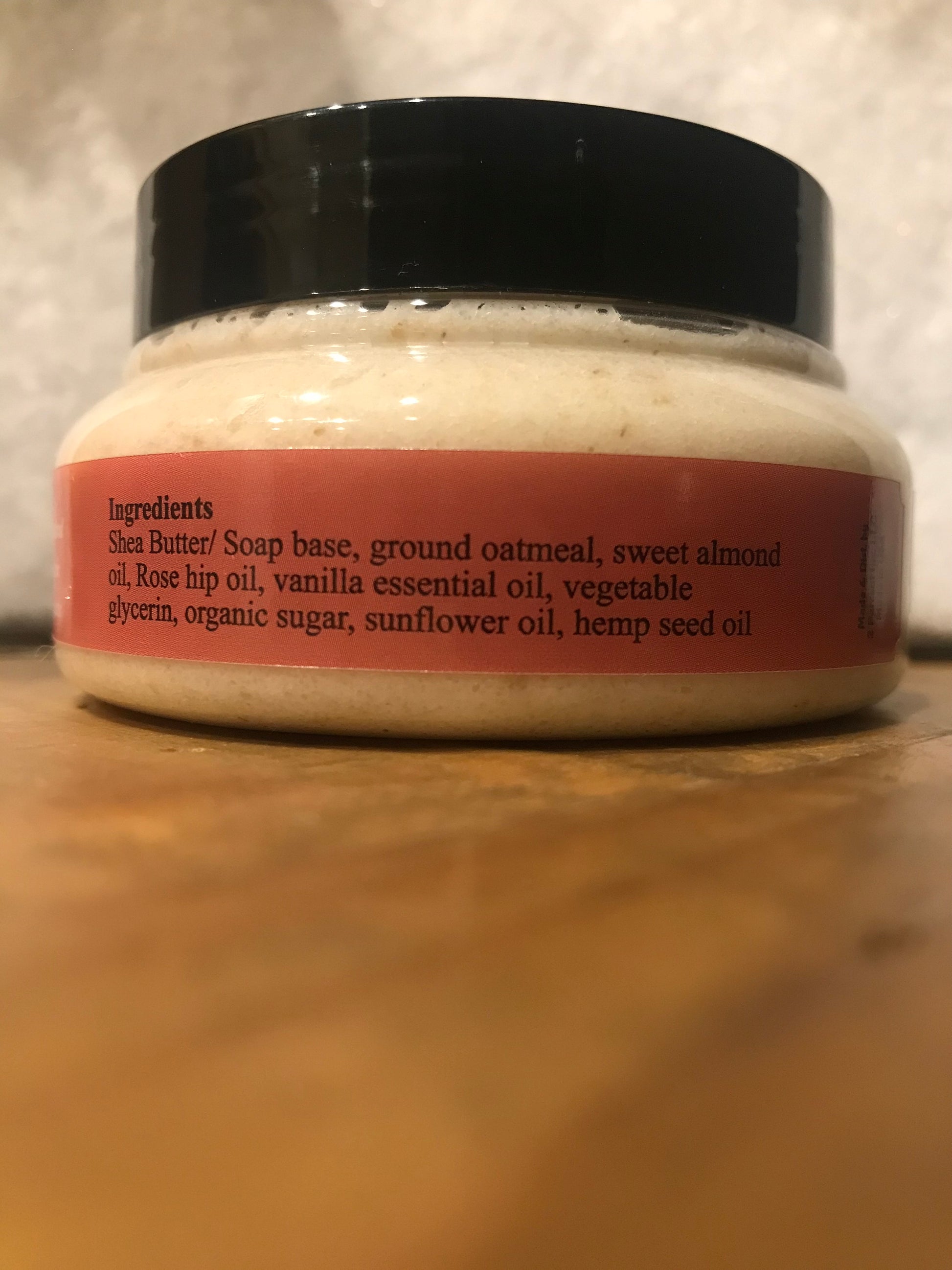 Ingredients: Shea butter/soap base, ground oatmeal, sweet almond oil, rose hip oil, vanilla essential oil, vegetable glycerin, organic sugar, sunflower oil, hemp seed oil